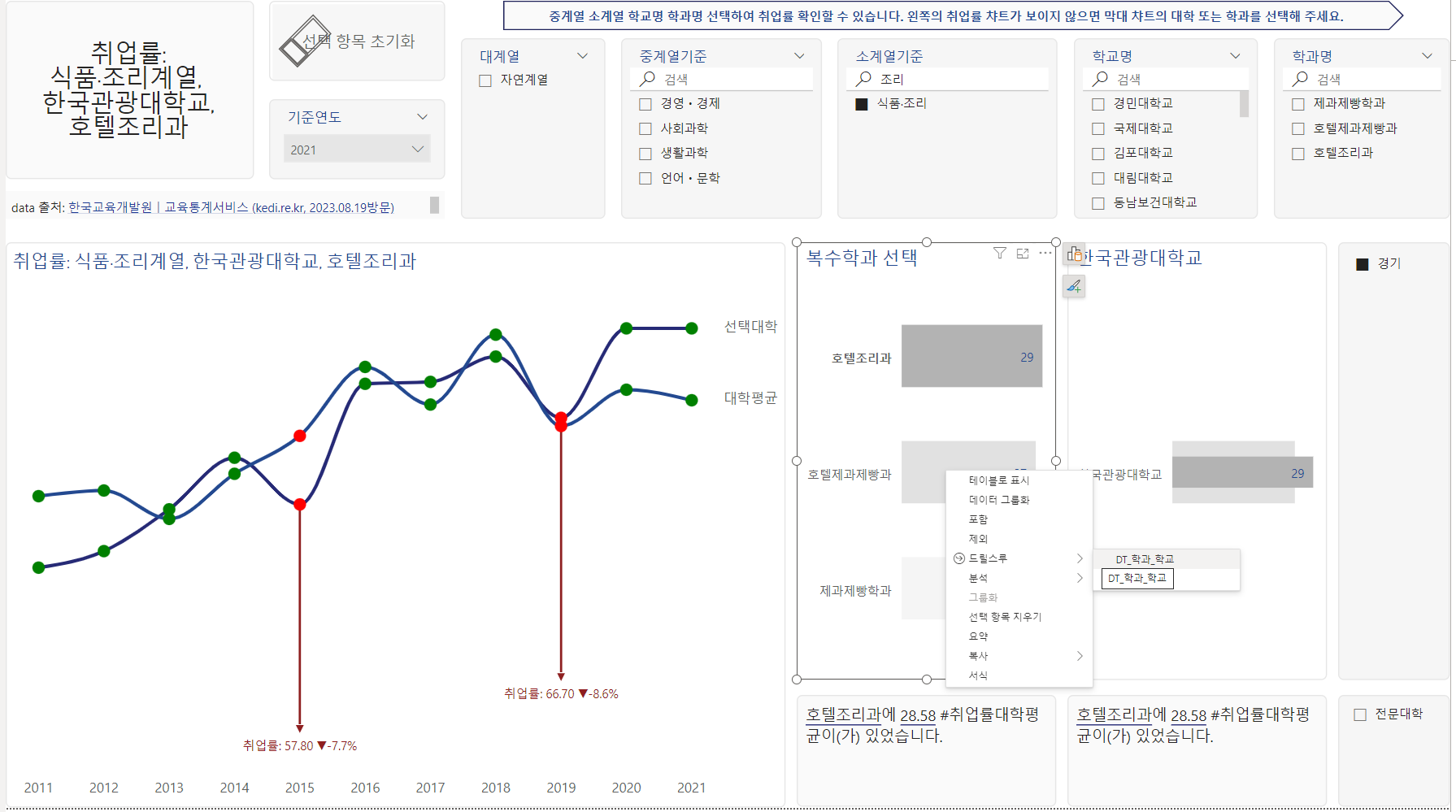 - 선형챠트에서는 직전년도 대비 취업률 하락 시 그 값을 설명하였습니다.